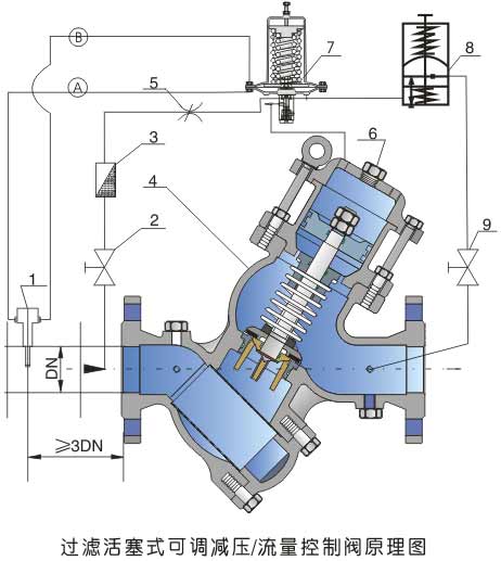 YQ98012型過濾活塞式可調(diào)減壓/流量控制閥是一種穩(wěn)定閥后壓力同時(shí)控制流量不大于設(shè)定量大值的目控閥門,這種穩(wěn)定不受閥前供水系統(tǒng)流量及壓力變化的影響。然而當(dāng)閥前流量小于設(shè)定值時(shí),主閥全開,不會(huì)增加流量。由畢托管傳遞壓差信號(hào)給限流導(dǎo)閥,限流導(dǎo)閥和針閥執(zhí)行兩路控制,通過限流導(dǎo)閥調(diào)節(jié)摞栓的調(diào)節(jié),使閥后流量達(dá)到設(shè)定值。通過減壓導(dǎo)閥調(diào)節(jié)摞栓的調(diào)節(jié),來控制主閥上游壓力;活塞下腔有節(jié)流孔與下游相通,可綬沖閥門的關(guān)閉。主閥兩端壓力差是閥門啟,閉的驅(qū)動(dòng)能源。主要用于給、排水、消防、空調(diào)和各類工礦企業(yè)等供水管網(wǎng)中需要過濾又要穩(wěn)定閥后壓力并對(duì)流量實(shí)現(xiàn)控制的場(chǎng)所和工況。
