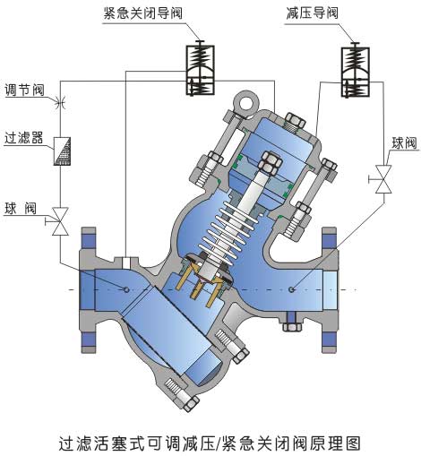 二、減壓緊急關(guān)閉閥特點(diǎn): 1.減壓緊急關(guān)閉閥調(diào)整操作靈活方便,(壓力不超過設(shè)定值)調(diào)整范圍大,可靠. 2.減壓效果極佳,無論上游壓力及流量如何變化,而設(shè)定的下游壓力均衡定不變. 3.既可減動壓,又可以減靜壓. 4.Y形寬體閥腔,流阻小、抗汽蝕性強(qiáng),無噪音. 5.緊急關(guān)閉導(dǎo)閥的調(diào)節(jié)靈活、方便、可靠. 6.本閥也可以單作緊急關(guān)閉閥用. 7.自帶過濾裝置及防震壓力表,使安裝尺寸縮短約40%,減少占用空間,節(jié)省投資成本. 8.內(nèi)外表面均噴涂環(huán)保涂層,確保產(chǎn)品的防腐蝕及安全性.