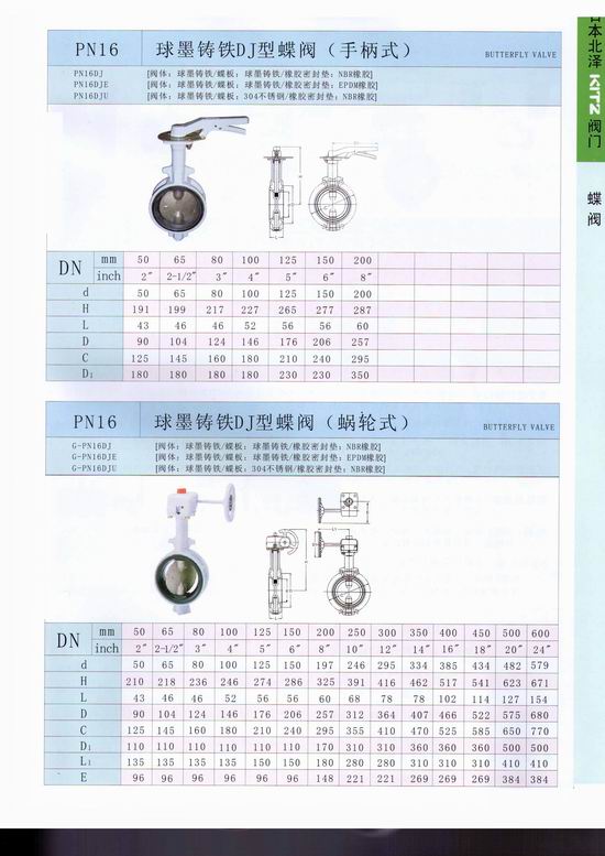 日本北澤KITZ蝶閥蝶閥不僅結構簡單、體積小、重量輕、材料耗用省,安裝尺寸小,而且驅(qū)動力矩小,操作簡便、迅速,并且還同時具有良好的流量調(diào)節(jié)功能和關閉密封特性,在大中口徑、中低壓力的使用領域,蝶閥是主導的閥門形式。手柄式 型號:PN16DJ (球墨鑄鐵蝶板) 蝸輪式 :G-PN16DJ (球墨鑄鐵蝶板) PN16DJU (不銹鋼蝶板) G-PN16DJU (不銹鋼蝶板)