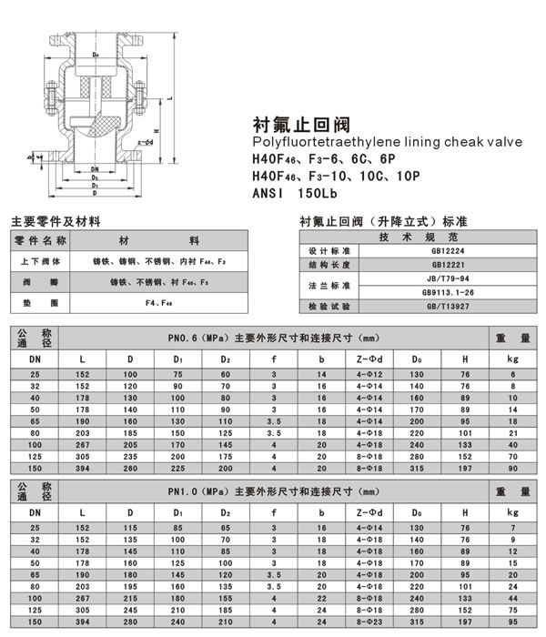 H40F46型襯氟止回閥是一種依靠介質(zhì)本身的流動而自動啟、閉閥瓣用來阻止介質(zhì)向逆向流動的自動閥門。襯里新型止回閥。FEP(F46)、PCTFE(F3)襯氟止回閥適用在-20℃~150℃的各種濃度的王水、硫酸、鹽酸、氫氟酸和各種有機酸、強酸、強氧化劑,F(xiàn)EP還適用于各種濃度的強堿有機溶劑以及其它腐蝕性氣體、液體介質(zhì)的管路上使用。 閥。 |